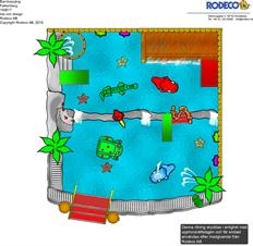 I bassängen finns massor av olika attraktioner som rutschkana, bubbelzoner, grotta, figurer som sprutar vatten m.m.